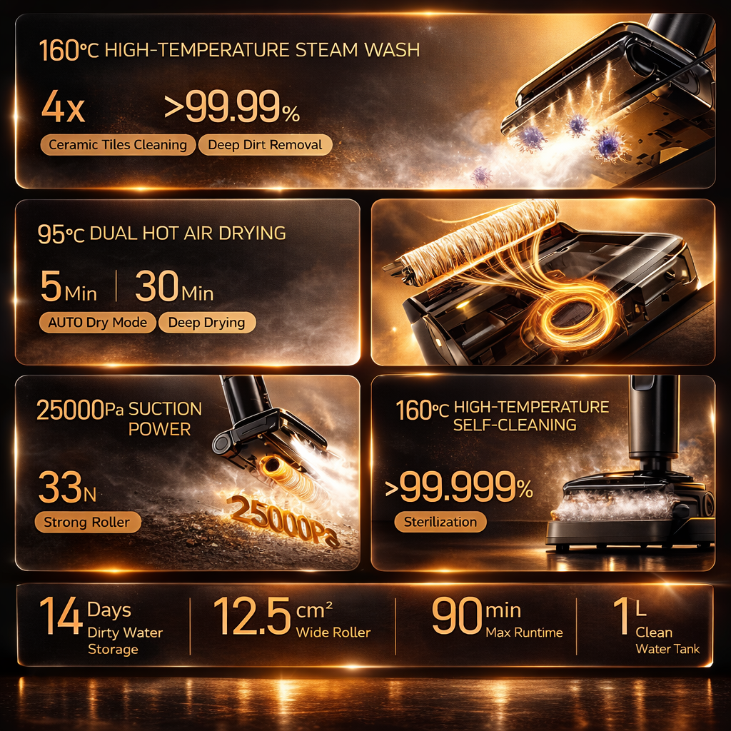 Combines steam, wash and vacuum in one step. High-temperature steam loosens stubborn grease and dried-on messes while powerful suction instantly lifts away dirty water. No pre-cleaning or chemical cleaners needed — safer for homes with kids and pets.